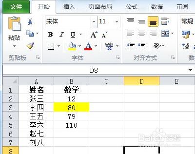 第七步,在表格的数学栏中输入一个数字。只要输入一个介于80和100之间的数字,单位格填充颜色将主动变为黄色,其他数字将不会填充颜色。