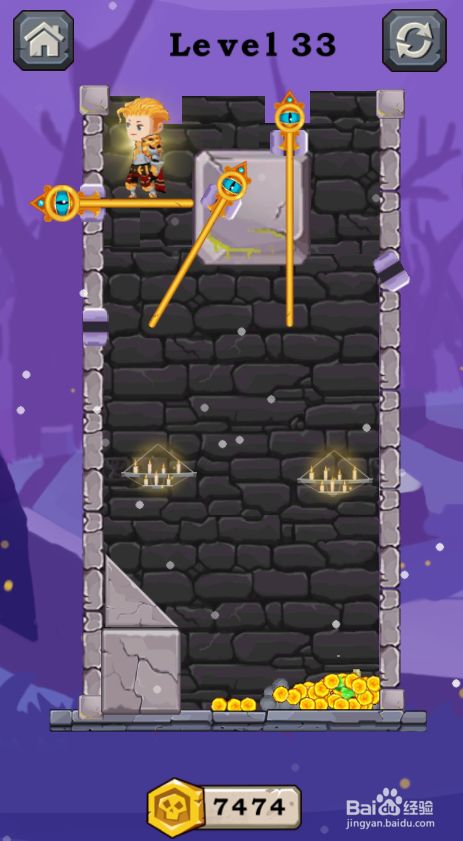 工具/原料三星Galaxy Tab S7安卓Android 11Gold Hero Rescue1.0.1方式/步骤1拔失落底部的斜插销,如图。2拔失落岩浆下侧的横插销,岩浆流到底部,如图。3拔失落水下侧的斜插销,水流进岩浆,岩浆当作为石头,如图。4拔失落宝藏下侧的插销,宝藏落到地面,如图。5拔失落金发少年下侧的插销,如图。6拔失落金发少年右侧的斜插销,金发少年获得宝藏,如图,这样就通关了。END
