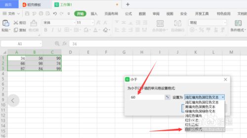 在新弹出的窗口中设置,小于的值为60,题中给定格局没有,选择【自界说格局】: