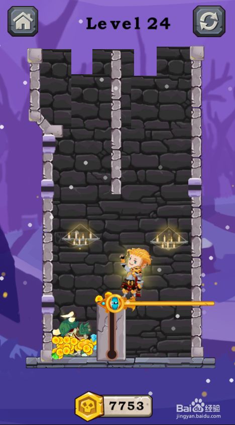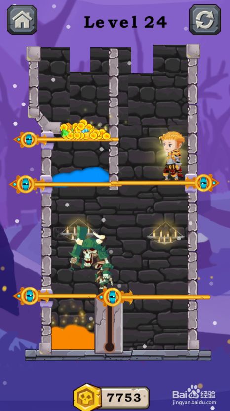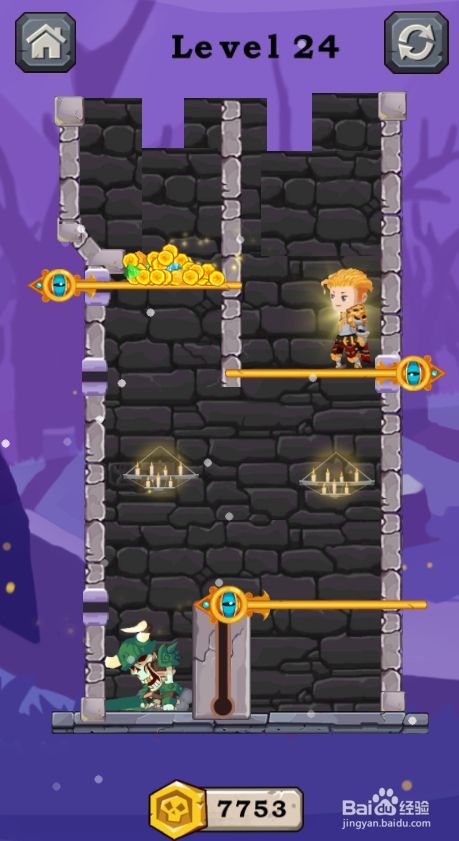 工具/原料三星Galaxy Tab S7安卓Android 11Gold Hero Rescue1.0.1方式/步骤1拔失落下侧的斜插销,如图。2滑动卫兵下侧的推拉杆,滑到上端,如图。3拔失落岩浆上侧的横插销,卫兵被覆灭失落,如图。4拔失落水下侧的横插销,如图。5拔失落宝藏下侧的横插销,如图。6拔失落金发英雄下侧的插销,金发英雄获得宝藏,如图,这样就过关了。END