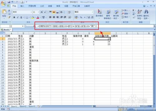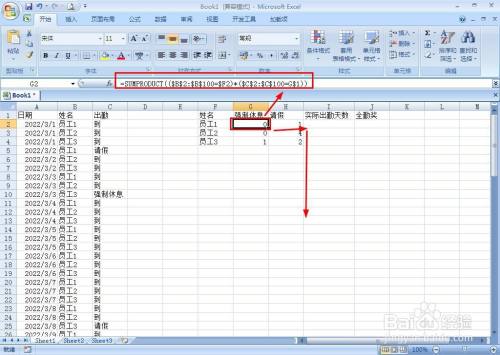 I2单位格输入公式计较现实出勤天数:=SUMPRODUCT(($B$2:$B$100=$F2)*($C$2:$C$100="到"))——回车后标的目的下填没收式。