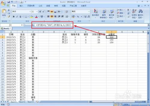 A列到C列是员工一个月的出勤环境,除强制歇息外,无告假奖300,其它告假4天以内奖200,告假跨越4天无出勤奖。