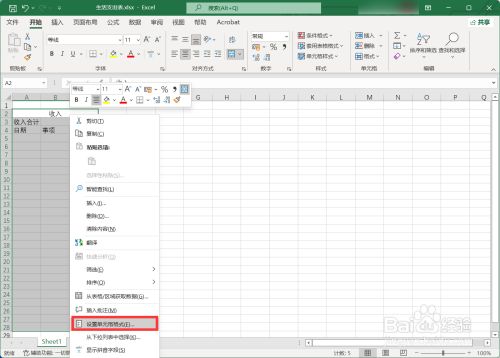 启动Excel软件,输入关于收入的项目,点击【归并居中】,把小题目设置为通栏结果。