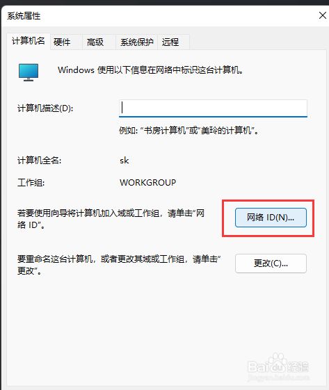 系统属性窗口,计较机名选项卡,点击若要利用标的目的导将计较机插手域或工作组,请单击收集 ID。