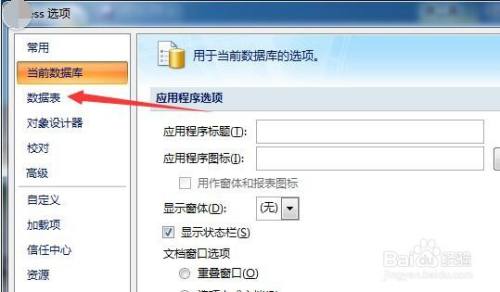 弹出了的access选项窗口中,点击左侧中的数据表的选项。