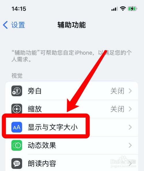 在辅助功能设置中,选择“显示与文字巨细”选项。