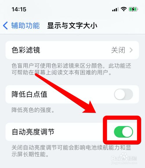 在显示与文字巨细页,把“主动亮度调节”功能激活。