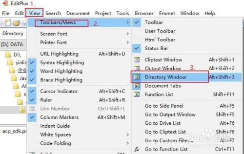 若是EditPlus没有默认打开Directory窗口,可在View东西栏中进行勾选显示: