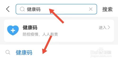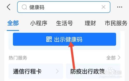 打开支付宝,在首页搜索框输入健康码,再点击健康码。