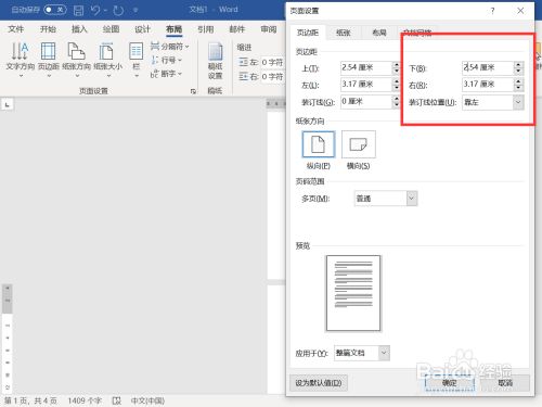 弹出窗口,单击下边距,输入框中数字较大,点窜为较小数据,缩短下方页边距。
