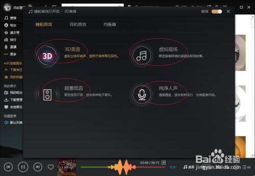 点佛趴沃击分歧图标可设置3D美音、虚拟现场、超重低音、纯净人声四种音响结果