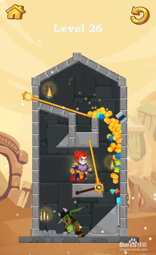 这一关是获得顶部的宝藏,有四个拉针与一个斜标的目的推拉杆,如图。