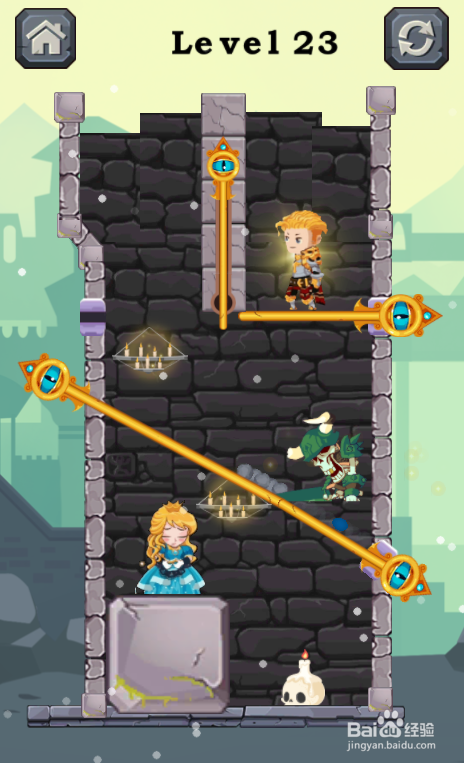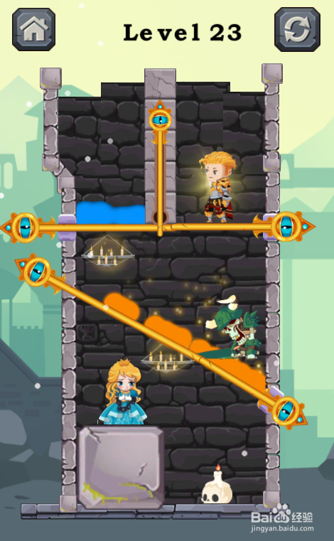 这一关是营救公本家儿,有四个拉针与一个竖标的目的推拉杆,环境如图。