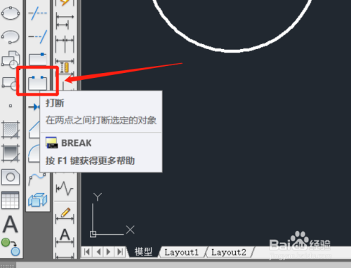 选择圆形,作为打断的对象,指定的位置即为打断的第一个点。