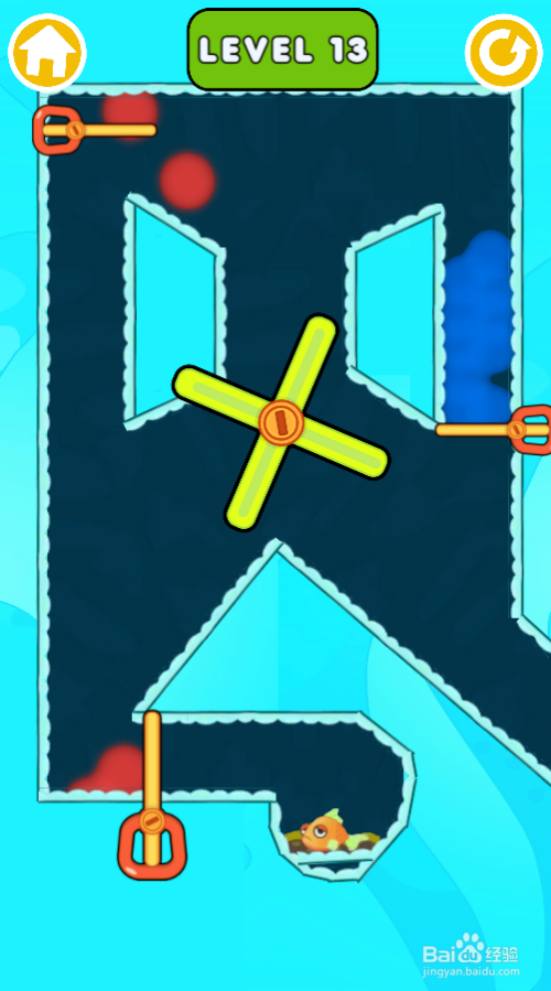 第十三关里面有三个推拉杆,中心位置是动弹的转轴,金鱼在底部,环境如图。