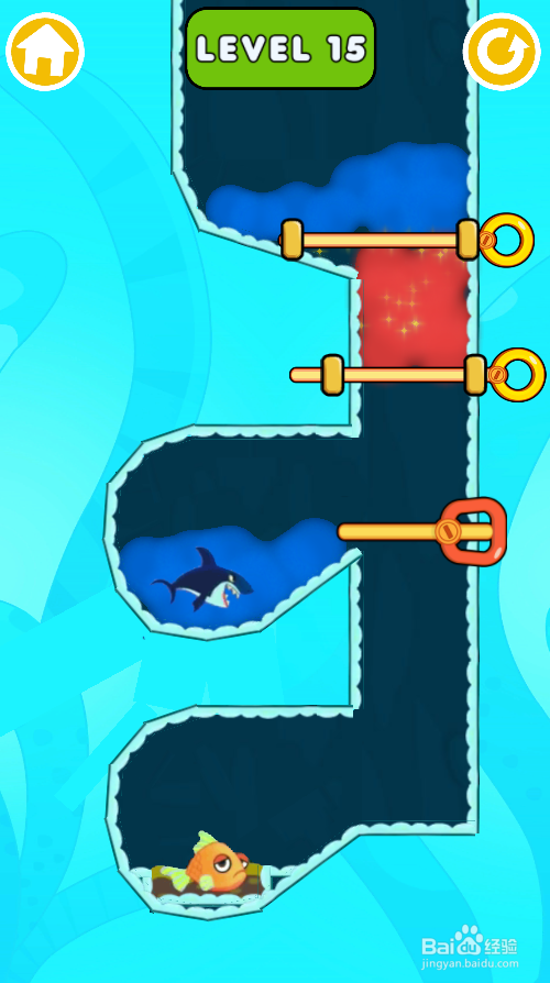 第十五关里面有两个横标的目的拉针与一个横标的目的推拉杆,金鱼在底部,环境如图。