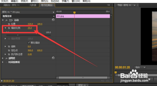可以在左上角的【特效节制台】选项按钮里面的进行【缩放比例操作,调整以完整显示。