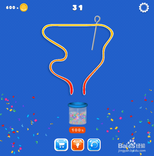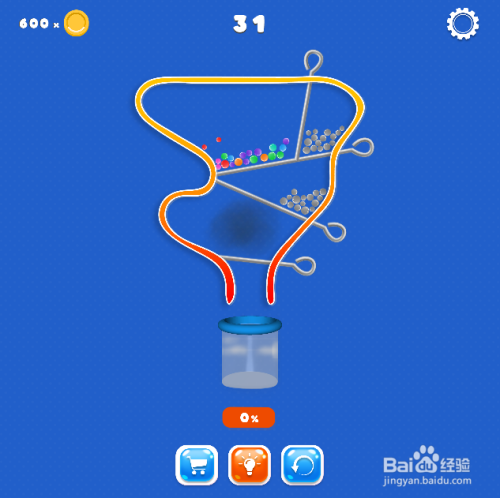 彩色小球100%进入瓶子,弹出通关画面,如图,这样就过关了。