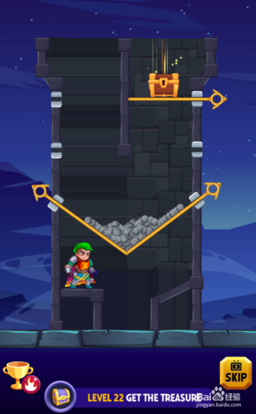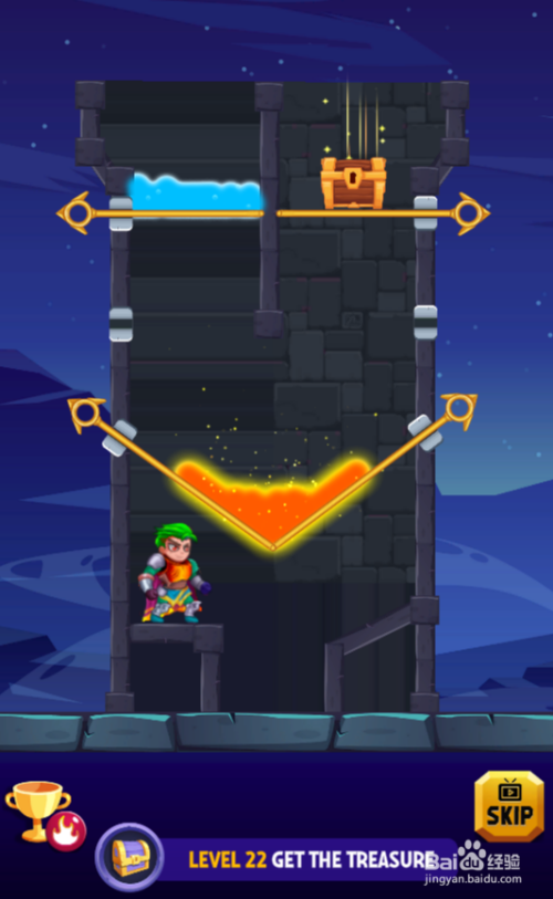 这一关是获取红色熔岩上侧的宝藏,有六个拉针,环境如图。