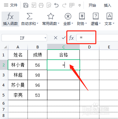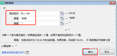 在【函数参数】对话框中,第一个参数后面的对话框中,输入B2>=60;第二个参数输入[及格];第三个参数,在对话框中输入英文状况下的双引号,完当作后点击【确定】按钮。