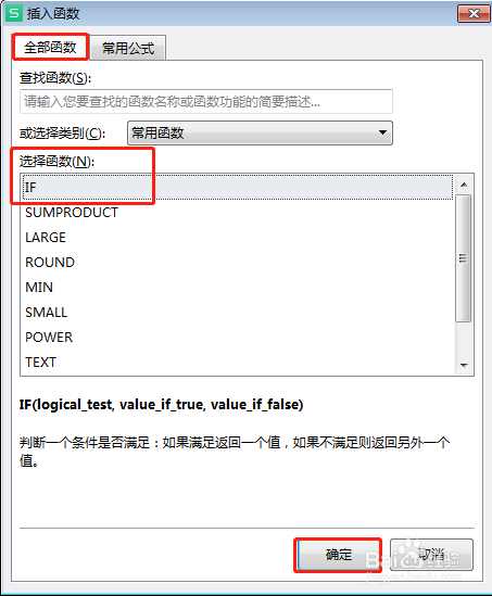 在【插入函数】对话框中,选择[IF]函数,完当作后点击【确定】按钮。