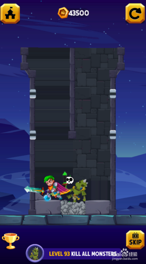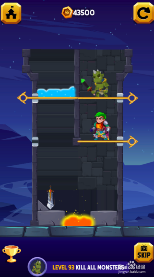 这一关是覆灭仇敌,共有四个横标的目的拉针,底部有熔岩,环境如图。