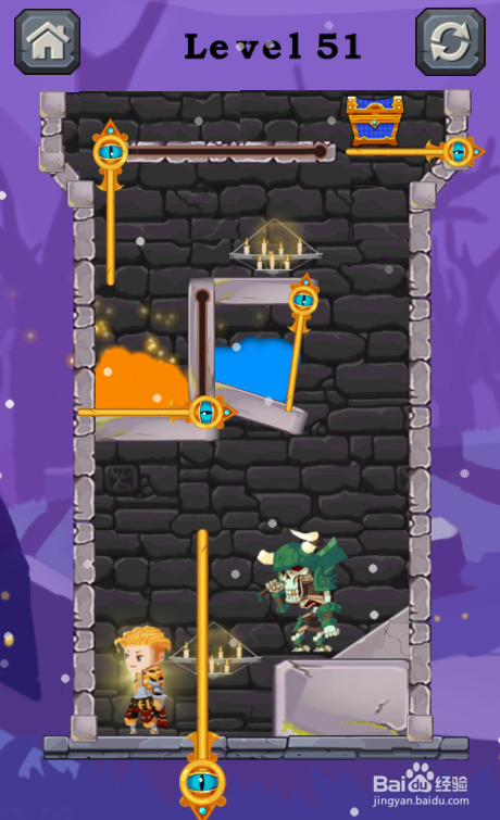 这一关共有三个拉针与两个推拉杆,仇敌站在宝箱下侧,环境如图。
