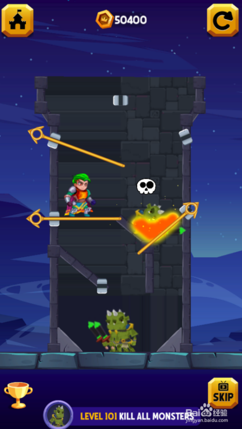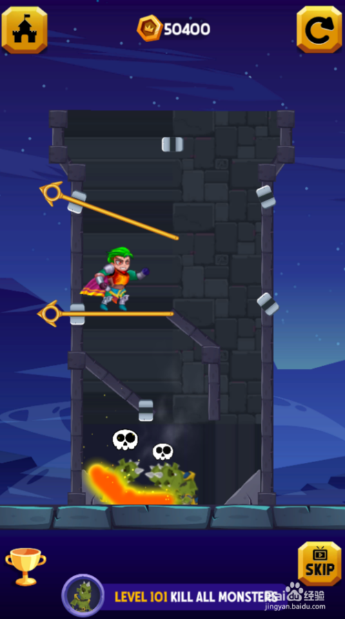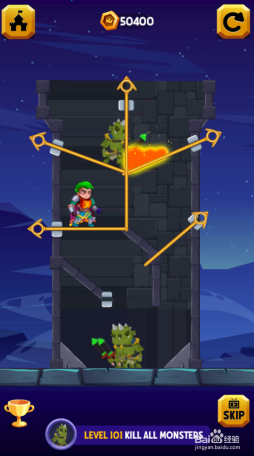 这一关共有六个拉针,使命是利用红色熔岩覆灭所有的仇敌,环境如图。