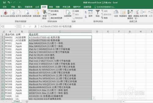 鼠标选中C2单位格,按住键盘上的ctrl+shift+标的目的下箭头,可以选中商品名称列的内容。