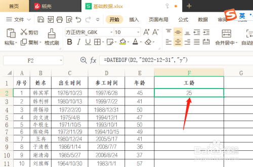 鼠标指标的目的F2单位格,当鼠标变为“+”时,双击鼠标左键,标的目的下填充,即可完当作整列填入
