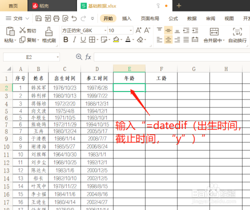 在单位格内输入“=datedif(出生时间,截止时间,“y”)”