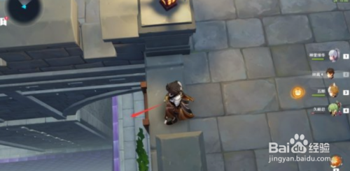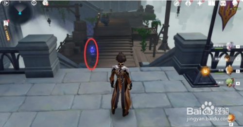 在捡完海螺之后各人先别急着走,先往如图所示的处所看,在这里有一个楼梯和一个平台,往下跳之后我们就能看到本秘境的第一个宝箱啦