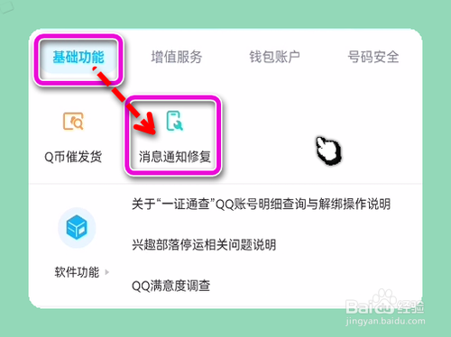 点击【基础功效】,单击【动静通知修复】进入页面。