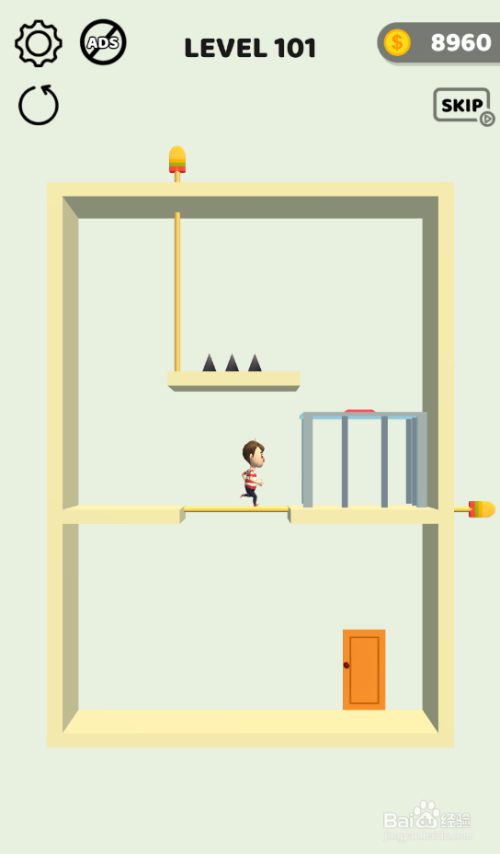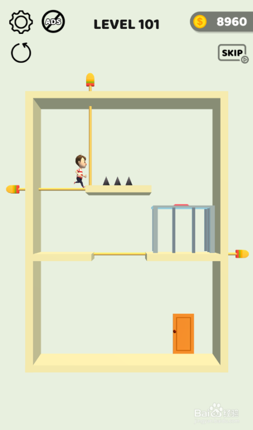 工具/原料一加10 Pro安卓Android 12Pull The Pins1.1.6方法/步骤1这个关卡内里有五个插销,山君在少年的下侧,环境如图。 2点击拔失野猪左侧的竖插销,如图。 3点击拔失笼子下面的横插销,如图。 4点击拔失少年下面的横插销,如图。 5点击拔失门上侧的横插销,如图。 6少年打开门顺遂脱离,弹出通关动画,如图。这样就过关了。 END
