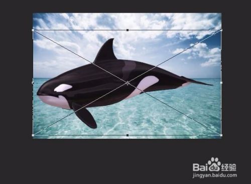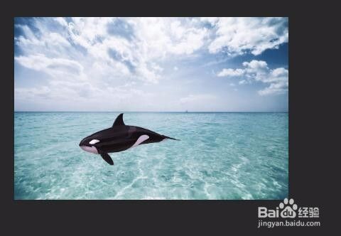 将鲸鱼图片置入画布中,要是鲸鱼图片不是透明照片需要先将鲸鱼抠出,将鲸鱼图片缩小至合适巨细,放置水面中