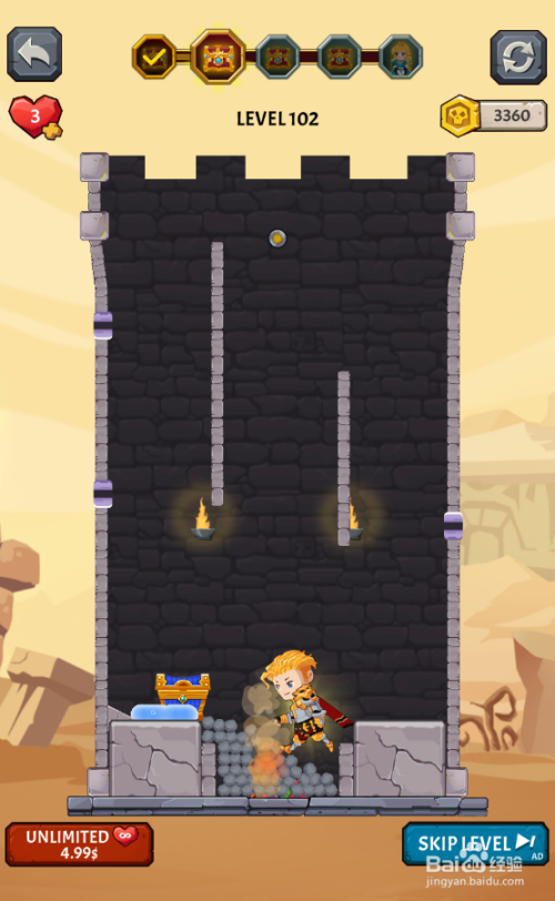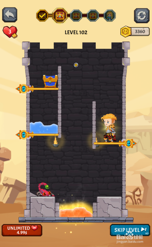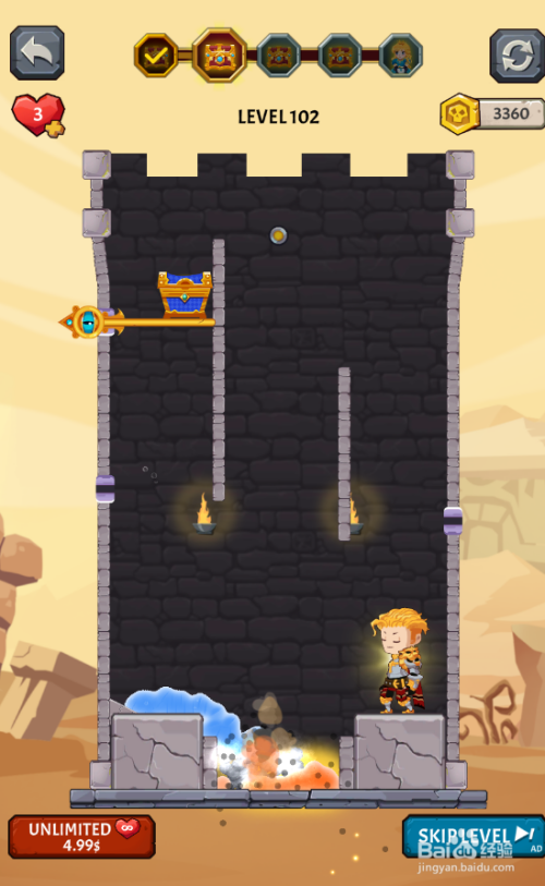 这个关卡的使命是得到顶部的宝箱,熔岩在底部,环境如图。