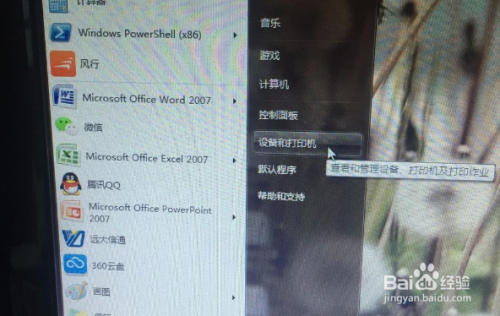 点击“开始”。找到”设备和打印机“一栏,单击”设备和打印机“
