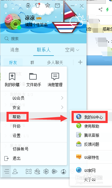 在本家儿菜单选项中,打开帮忙-我的QQ中间