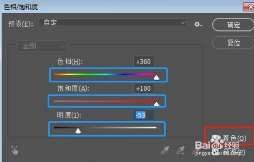 勾选着色,按照本身喜欢的颜色,调解色相、饱和度和明度的参数;