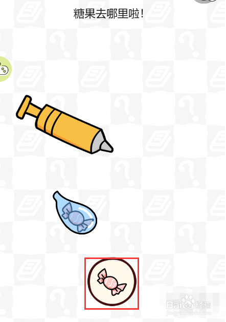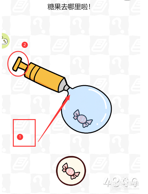 谜底:先把气球放在打气筒上,然后打气,就找到糖果了(右图)。