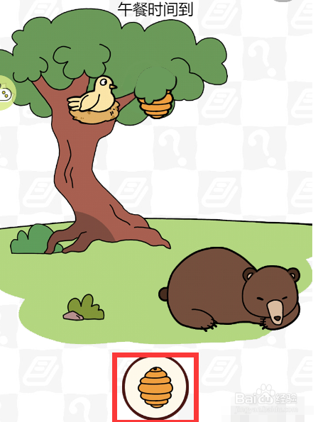 谜底:先在鸟身上拔一根羽毛,把熊弄醒,接着让熊把马蜂窝捅下来就找到了(右图)。