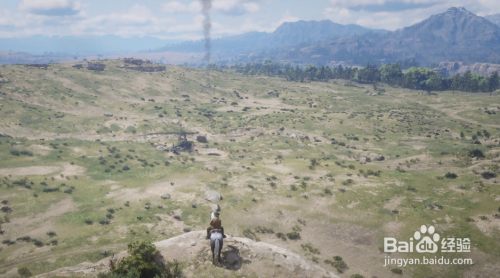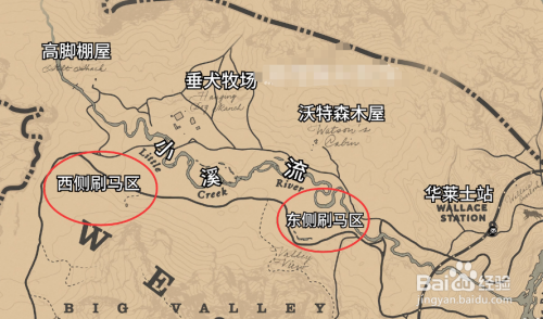 接着来到区域2,这里会刷新挑战需要的所有野马,如图所示的三个圈为马匹的刷新点,西侧在烧毁的矿井四周的草原上,中侧在我们骑手挑战4拖行农人的山顶上,东侧在茕居农人小屋右侧的山地上。