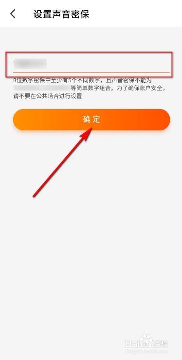 第七步,在方框处输入声音密保的8位数字,再点击“确定”.