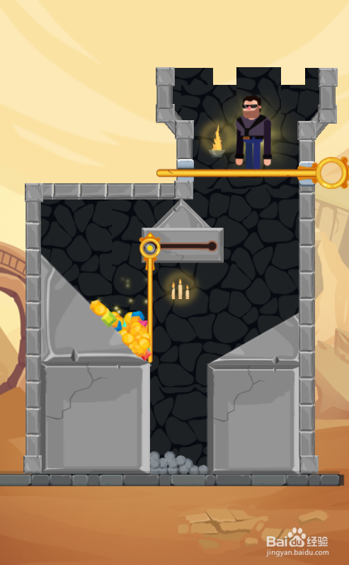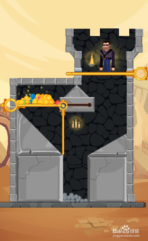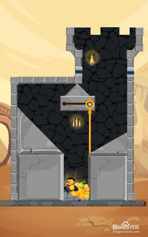 这一关的大胡子英雄站在熔岩上侧,宝藏在左侧顶部,内里有两根拉针和一根推拉杆,环境如图。