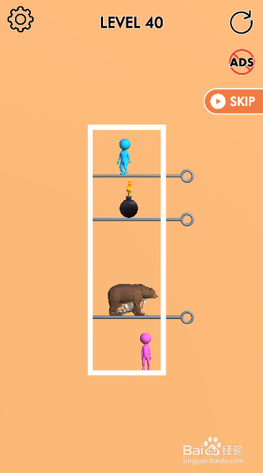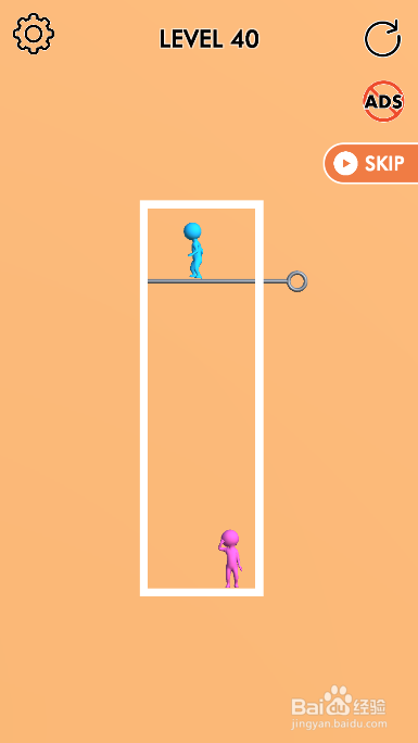 这一关的蓝色人站在顶部,粉色人站在底部,内里有四个拉针,环境如图。