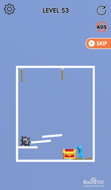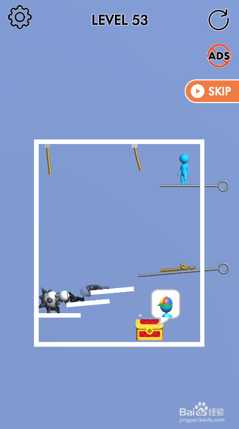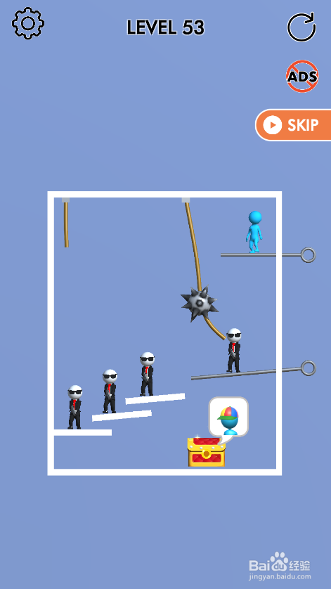 这一关的蓝色人站在黑衣人上侧,宝箱在黑衣人下侧,内里有两个拉针,环境如图。