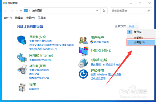 打开Win10电脑的“节制面板”,将“查看方式”设置为“小图标”。