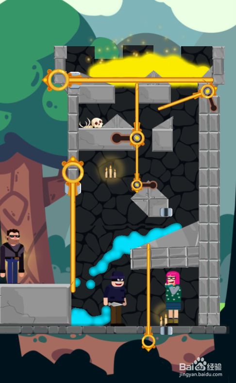 这一关的使命是营救女孩,熔岩在顶部,女孩站在匪徒右侧,内里有四根拉针和三根推拉杆,环境如图。