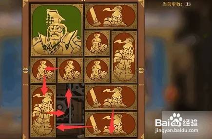 第三步:右下小方块左移,右上小方块下移一格,右上竖直方块下移一格,左上程度方块右移,将军上移一格,左下小方块上移程度放置。