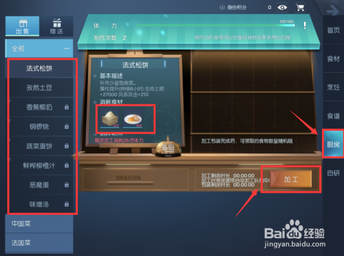 左侧栏点开全数,选择一个不加锁的餐点,查看耗损的食材,食材充沛的环境下,直接点击右下角的加工图标,即可举行摒挡建造。